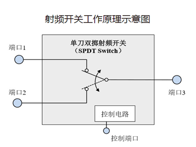 射频开关的工作原理如下图所示:当射频开关的控制端口加上不同电压时,射频开关各端口将呈现不同的连通性。以单刀双掷射频开关为例,当控制端口加上正电压时,连接端口 1 与端口 3 的电路导通,同时连接端口 2 与端口 3 的电路断开;当控制端口加上零电压时,连接端口 1 与端口 3 的电路断开,同时连接端口 2 与端口 3 的电路导通。